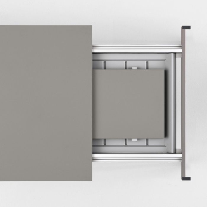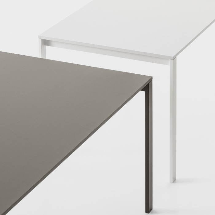 Le gambe verniciate a polveri, con effetto soft-touch, si abbinano cromaticamente al piano, creando un piacevole effetto monomaterico e monocromatico.