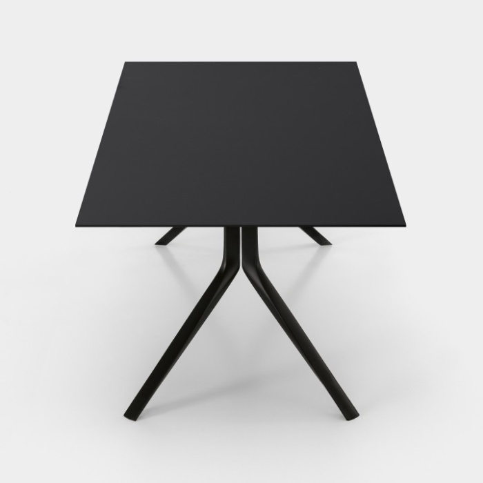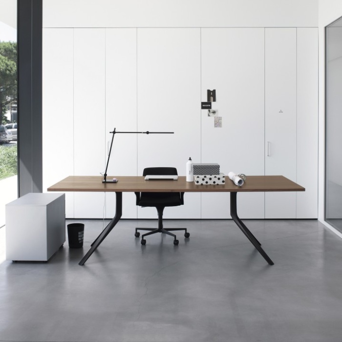 Le gambe in alluminio spazzolato o verniciato si abbinano a piani in laminato, Fenix-NTM o legno impiallacciato.
