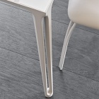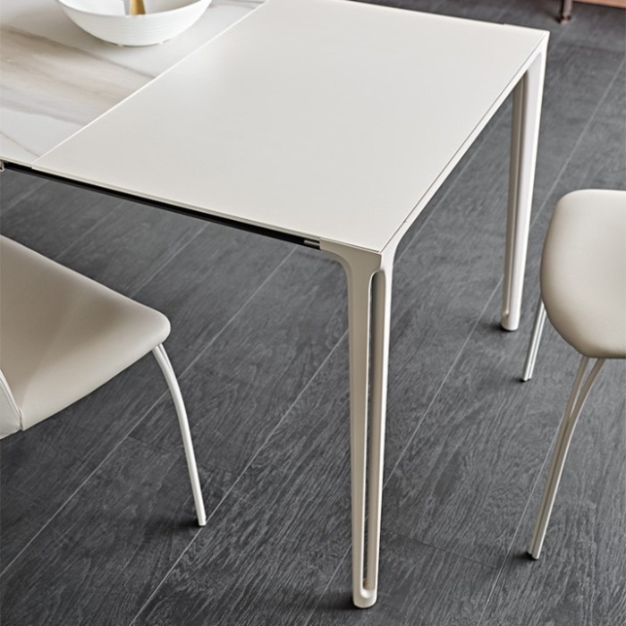 Le gambe scolpite presentano una cavità verticale che diventa il segno distintivo del design, valorizzata dalle finiture verniciate disponibili in una varietà di tonalità, dalle più intense e decise alle più chiare e luminose. Lo stesso trattamento viene ripreso nella cornice del piano in ceramica, creando un perfetto dialogo tra struttura e superficie. La scelta della ceramica Marmi per il piano conferisce al tavolo un aspetto elegante e resistente, ideale per un uso quotidiano che non rinuncia al prestigio estetico.