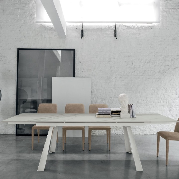 Un tavolo allungabile che si distingue per le linee rette e contemporanee delle 4 gambe rastremate e concave che conferiscono un aspetto solido ma leggero. Il piano ultrasottile, disponibile in materiali solidi e duraturi, rende questo tavolo un complemento molto funzionale e pratico, che saprà resistere all'usura delle attività domestiche. L'ampia scelta di finiture lo rendono facilmente adattabile ad interni in stile classico, vintage e moderno, donando una sensazione di calore ed ospitalità alla tua cucina, soggiorno o ufficio. Un tavolo allungabile solido e duraturo che riesce a soddisfare ogni esigenza di spazio ed ospitare fino a 12 persone.