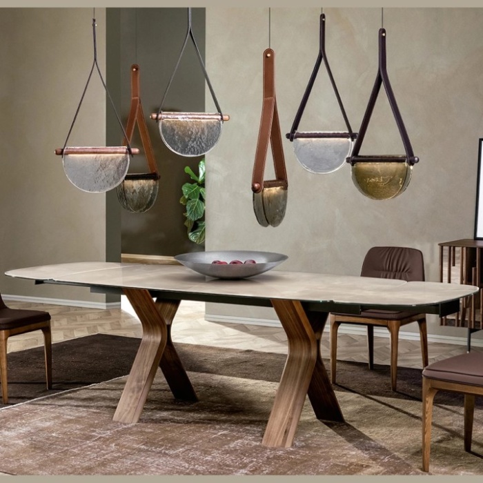 Il tavolo, disponibile nelle versioni fissa o allungabile, rappresenta una sintesi perfetta tra design contemporaneo e artigianalità. La sua base in legno termocurvato, vera protagonista del progetto, esprime con eleganza tutta la sapienza della lavorazione del legno, assumendo forme sinuose che dialogano armoniosamente con i materiali dei piani. Questi ultimi sono disponibili in vetro, gres porcellanato o vetroceramica, finiture che uniscono bellezza estetica a resistenza e funzionalità.