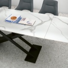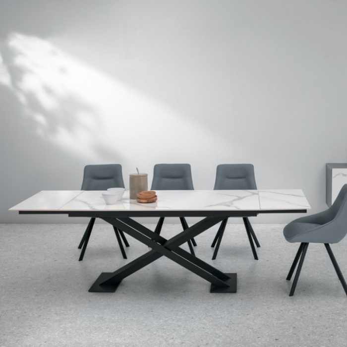 La particolarità del modello Tolomeo è la presenza di allunghe laterali integrate, a libro nella versione in laminato oppure a estrazione simmetrica nelle versioni in gres o vetro. Questa caratteristica lo rende ideale per accogliere comodamente fino a 10 persone, senza rinunciare a un look sobrio e contemporaneo.