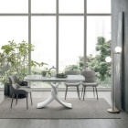 La grande novità del tavolo Twist è il piano in vetro Grafica Japan Sakura.
