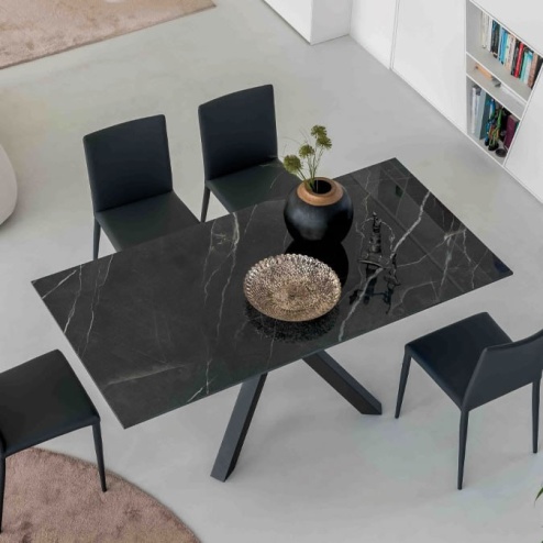 Il piano del tavolo è disponibile in due lussuosi materiali: il nobilitato e la ceramica. Il nobilitato offre una superficie liscia e facile da pulire, mentre la ceramica aggiunge un tocco di raffinatezza e resistenza all'usura, creando un'atmosfera di eleganza nel tuo spazio pranzo.
