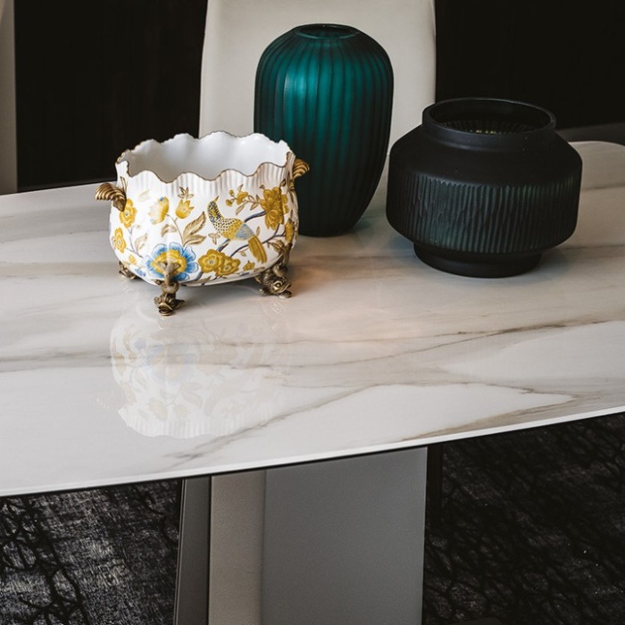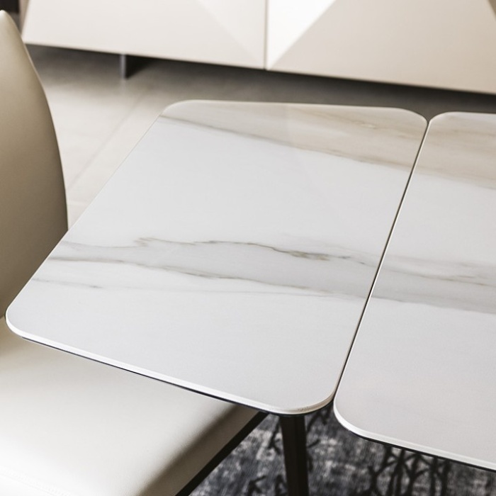 Il piano in ceramica Marmi, disponibile in una ricca selezione di raffinate nuance che spaziano dalle tonalità più scure e decise a quelle più chiare e luminose, esalta la qualità estetica del tavolo e ne amplifica il pregio. Grazie al meccanismo di allungamento fluido e intuitivo, il Duffy Keramik Drive si trasforma rapidamente da tavolo compatto a tavolo rettangolare allungabile, mantenendo una linea armoniosa e un design impeccabile anche nella versione estesa.
