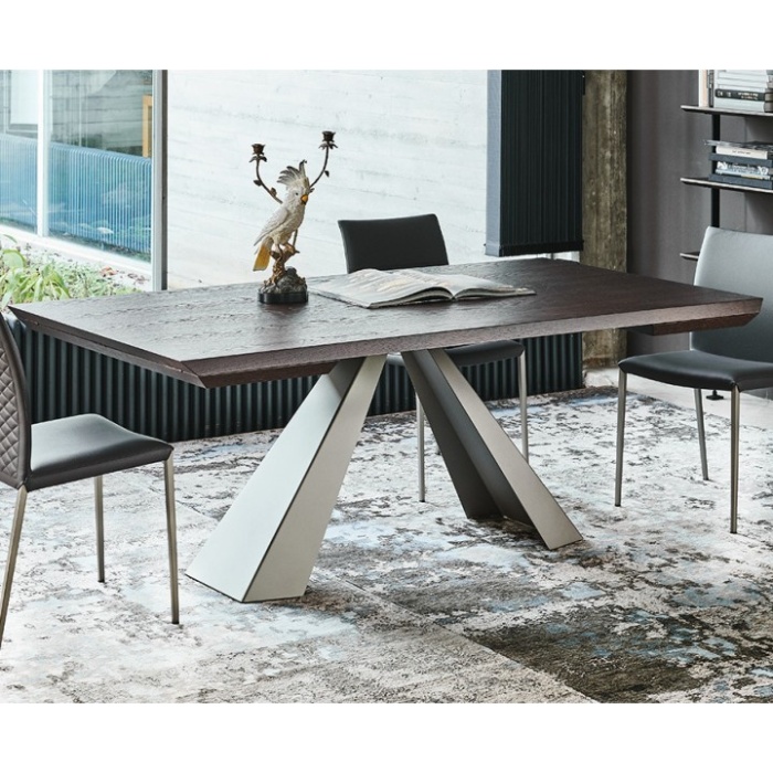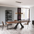 Più sobrio è invece il tavolo Eliot Wood con piano del tavolo in legno e bordi irregolari in massello. Nella versione allungabile Eliot Wood Drive i bordi sono regolari con taglio obliquo. Per un risultato più compatto anche trattandosi di un tavolo in legno allungabile che sfiora i 3 metri di lunghezza.