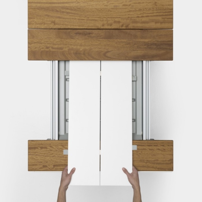 La versione allungabile è dotata di prolunghe in alluminio che si alloggiano ordinatamente in un vano dedicato, garantendo praticità e un’estetica pulita.