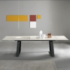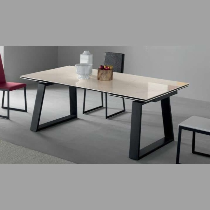 Il tavolo Mango 160 di Compar è un tavolo allungabile con gambe trapezoidali in metallo verniciato a polvere. Telaio allungabile in alluminio con 2 allunghe. Piano in ceramica.