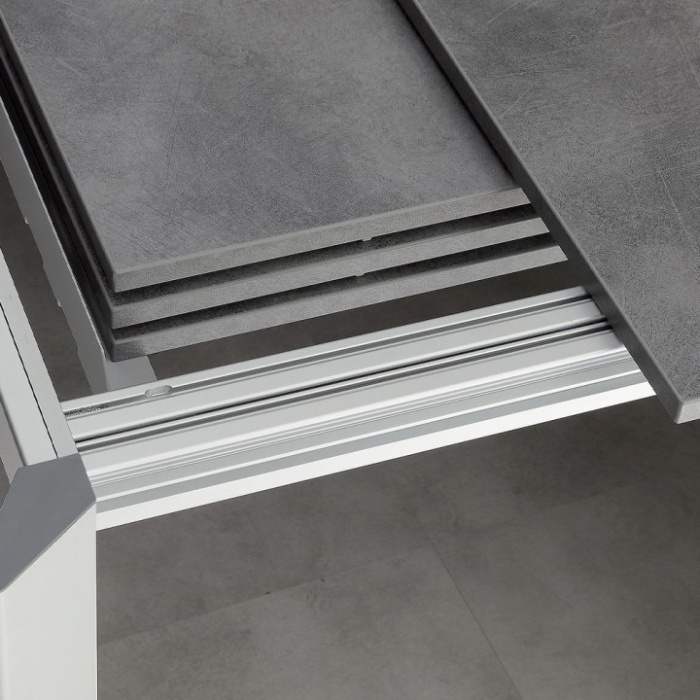Disponibile con piano in nobilitato nelle finiture bianco, cemento, antracite, pietra grey e rovere nodato, e struttura in alluminio naturale anodizzato o verniciato,