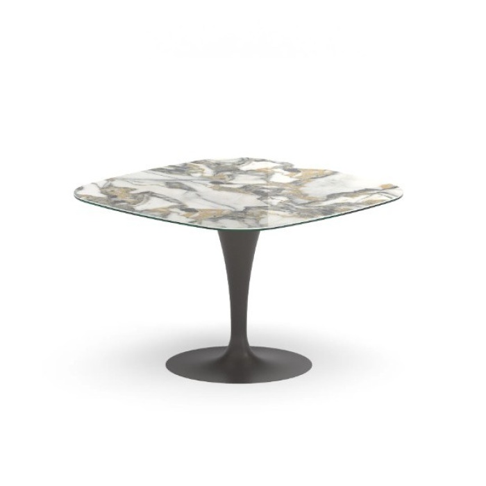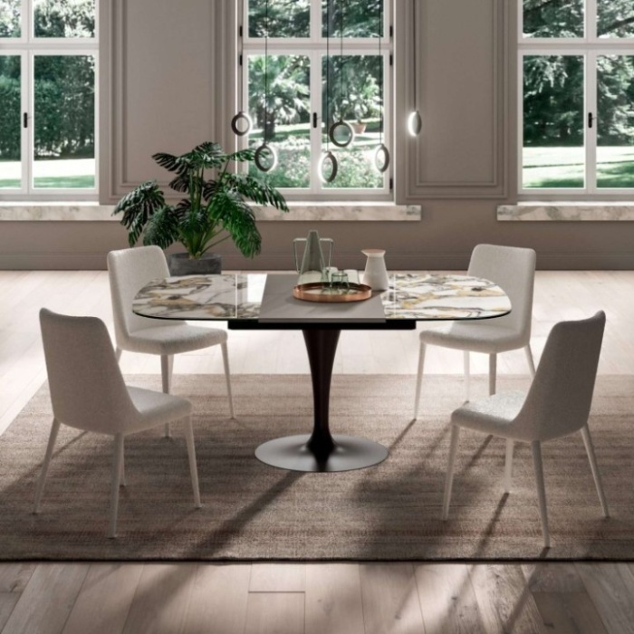 La base centrale in metallo verniciato garantisce stabilità e resistenza, oltre a donare al tavolo un look sobrio e contemporaneo.
