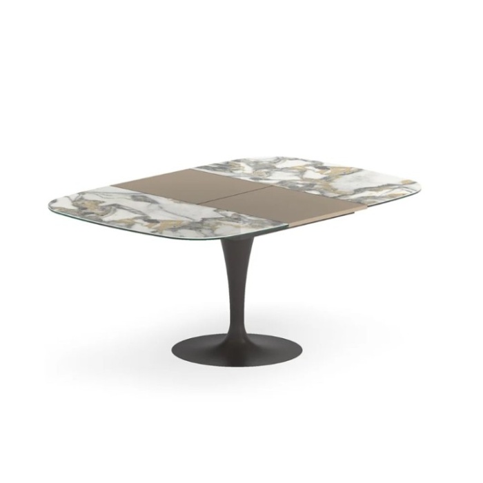 Grazie al suo meccanismo di apertura sincronizzato, il piano si apre con facilità per mostrare l’allunga interna in nobilitato che si solleva grazie a un binario integrato nel carter centrale, permettendo di trasformare il tavolo da una dimensione compatta a un piano capace di ospitare fino a 10 persone. La base centrale in metallo verniciato garantisce una stabilità eccellente e offre un’estetica pulita e moderna.