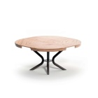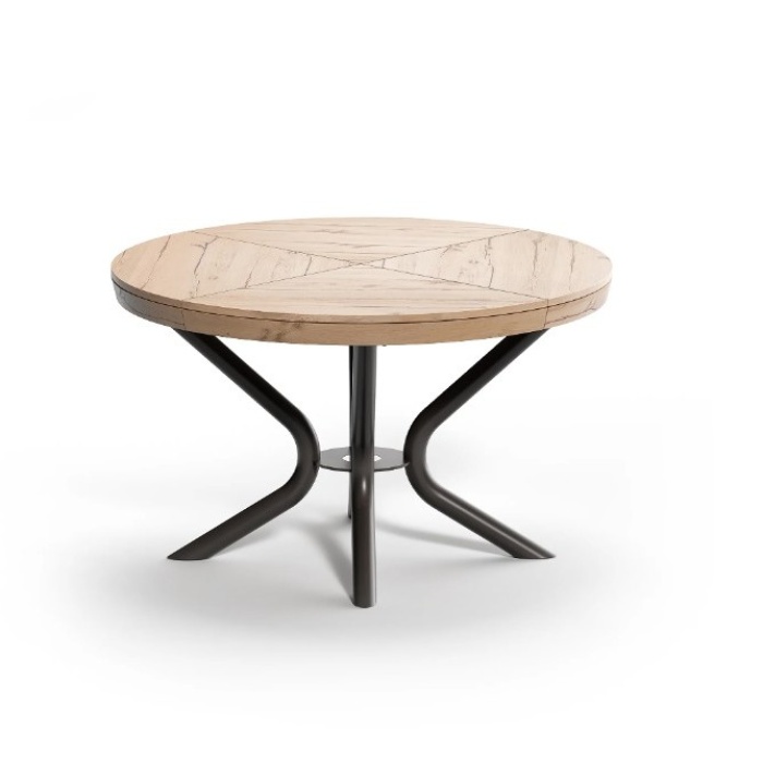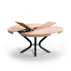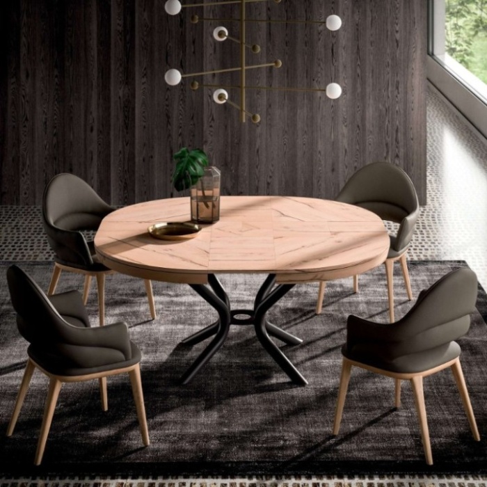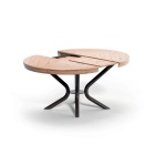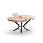 Cirkle è caratterizzato da un  piano rotondo in legno capace di trasformarsi per accogliere fino a 10 persone: grazie al sistema di scorrimento con guide metalliche, il piano si apre con semplicità, rivelando allunghe integrate in legno che permettono di ampliare la superficie fino a un massimo di 165 x 165 cm.