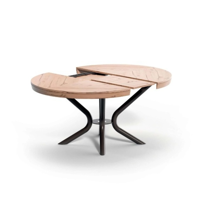 Dalla forma circolare, Cirkle si apre grazie a un meccanismo a guide metalliche, trasformandosi in un ampio tavolo capace di accogliere fino a 10 persone.
