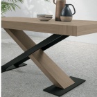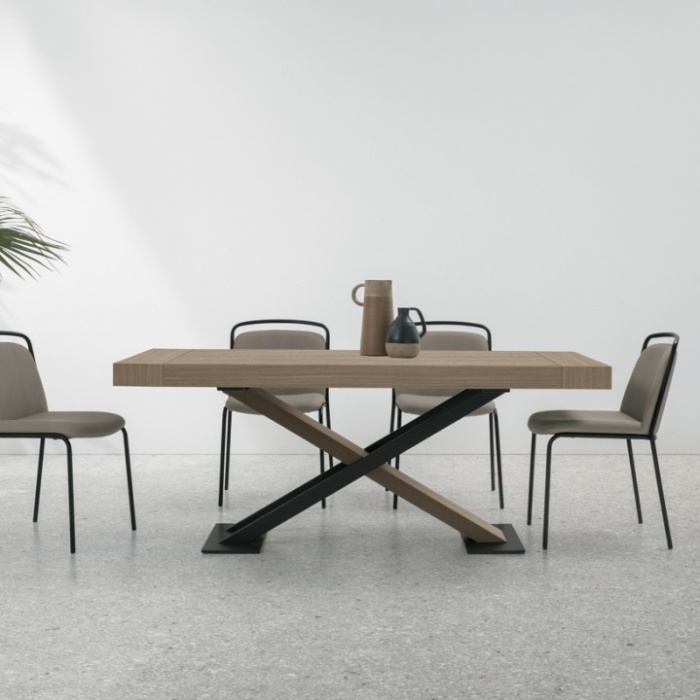La struttura è solida e moderna, grazie al basamento centrale in metallo verniciato, che garantisce stabilità e un look deciso. Il piano in laminato spessorato è lavorato con tecnica "folding", una lavorazione che consente finiture a 45° senza giunte visibili, regalando al tavolo un’estetica raffinata e un aspetto monolitico. Le allunghe laterali integrate scorrono con facilità, mantenendo continuità cromatica e materica con il piano principale.