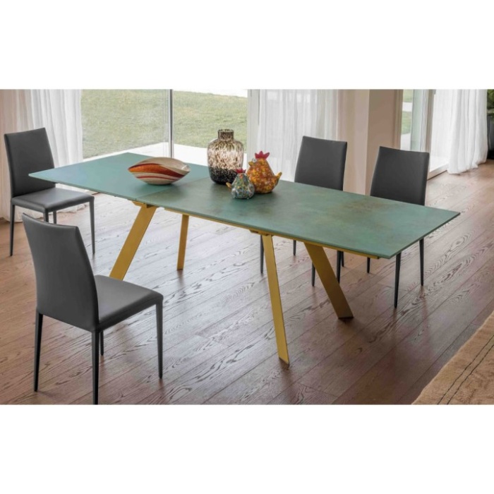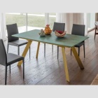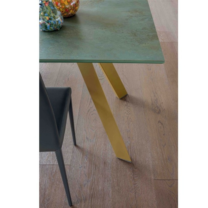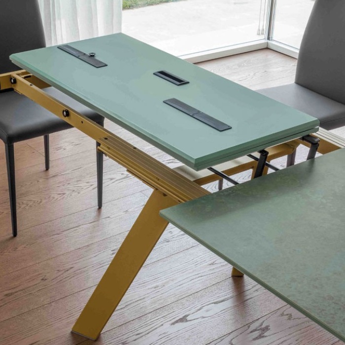Design Razionale e Struttura a 4 Gambe Il tratto distintivo del tavolo Vertigo risiede nella sua architettura portante: quattro solide gambe in metallo dal profilo deciso sostengono il piano garantendo una resistenza superiore. A differenza dei modelli a base centrale, la configurazione a gambe perimetrali incornicia la zona dining, offrendo un impatto visivo di grande solidità e rigore geometrico. Durante l'apertura, il meccanismo telescopico permette alle gambe di scorrere esternamente, rimanendo sempre alle estremità del tavolo; questo accorgimento fondamentale assicura che nessun commensale debba scontrarsi con i supporti strutturali, garantendo un comfort di seduta totale per tutti gli ospiti. La struttura metallica è personalizzabile in numerose finiture goffrate, come il moderno Grafite (M11), il ricercato Bronzo (M19) o il lussuoso Oro (M51).