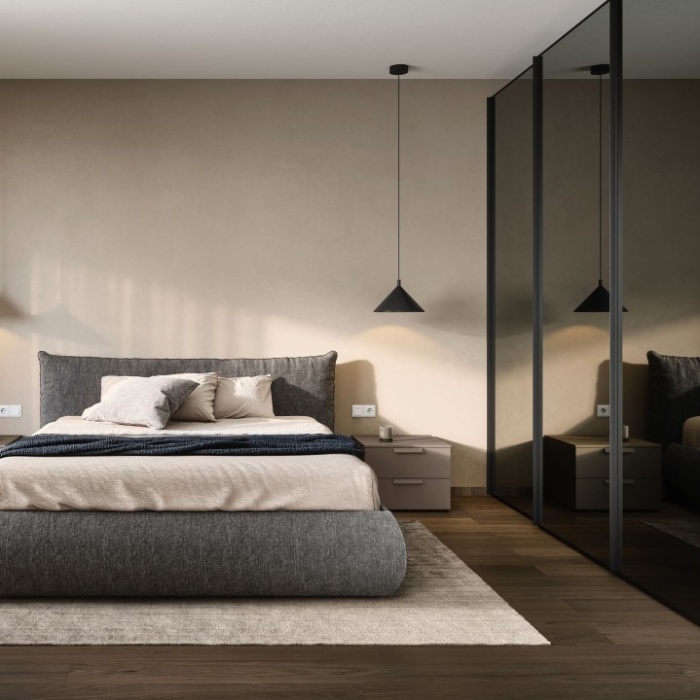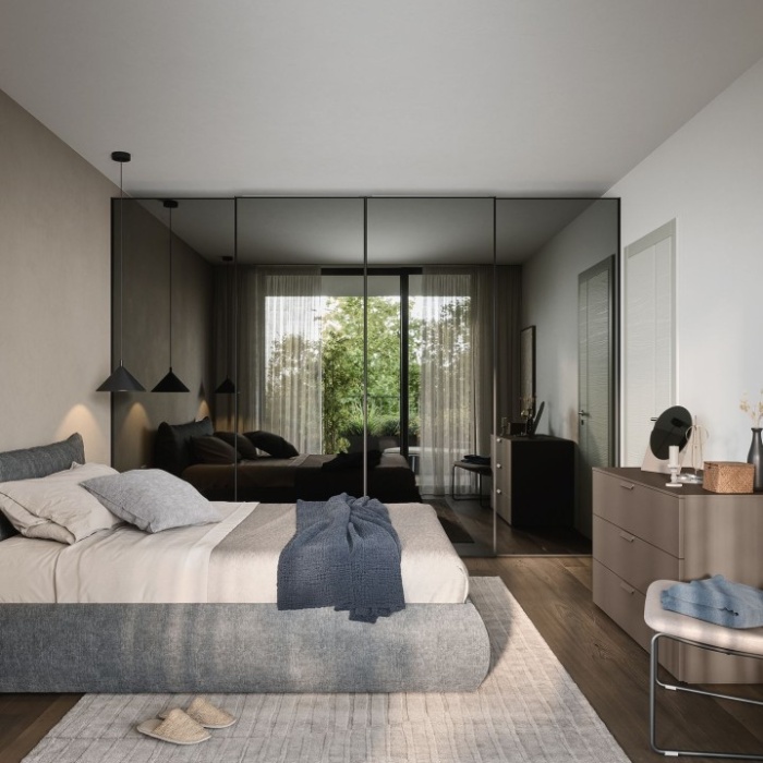 Gli armadi scorrevoli sono attrezzati di serie con un meccanismo di apertura/chiusura ammortizzata e automatica per le ante che utilizza il sistema Softspace.