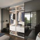 L’estetica dell’armadio non cambia: il sistema di apertura/chiusura ammortizzata viene fissato al binario dell’armadio e nella parte posteriore dell’anta. In questo modo