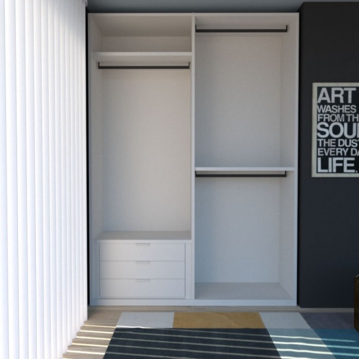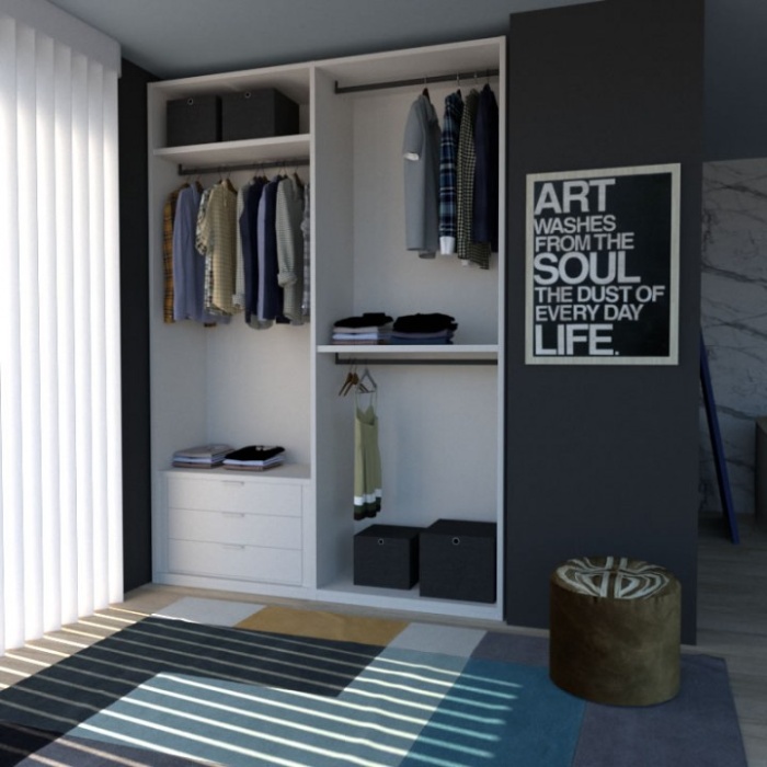 Ciascun modulo, inoltre, è dotato di un comodo ripiano e due tubi appendiabiti in finitura brunita, posizionabili a varie altezze, ed è completabile con ulteriori accessori per una perfetta organizzazione interna del proprio armadio.