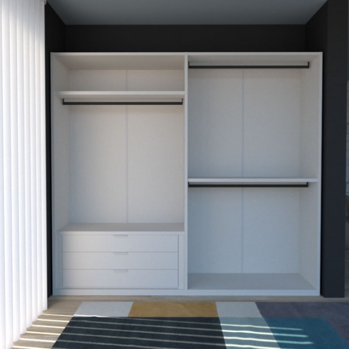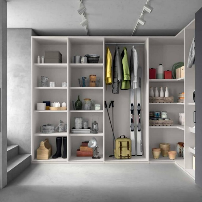 Ciascun modulo, inoltre, è dotato di un comodo ripiano e due tubi appendiabiti in finitura brunita, posizionabili a varie altezze, ed è completabile con ulteriori accessori per una perfetta organizzazione interna del proprio armadio.