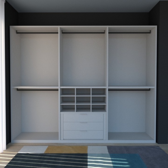 Ciascun modulo, inoltre, è dotato di un comodo ripiano e due tubi appendiabiti in finitura brunita, posizionabili a varie altezze, ed è completabile con ulteriori accessori per una perfetta organizzazione interna del proprio armadio.