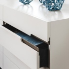 Ciro è una linea di comò e comodini abbinati dall'aspetto essenziale ed elegante. Le linee pure e le forme classiche vengono impreziosite da inserti in pelle o ecopelle, disponibili in un'ampia palette di colori raffinati. Paolo Cattelan idea questo comò di design moderno con otto cassetti, struttura e frontali in legno verniciato e maniglie a gola con delicati inserti a contrasto