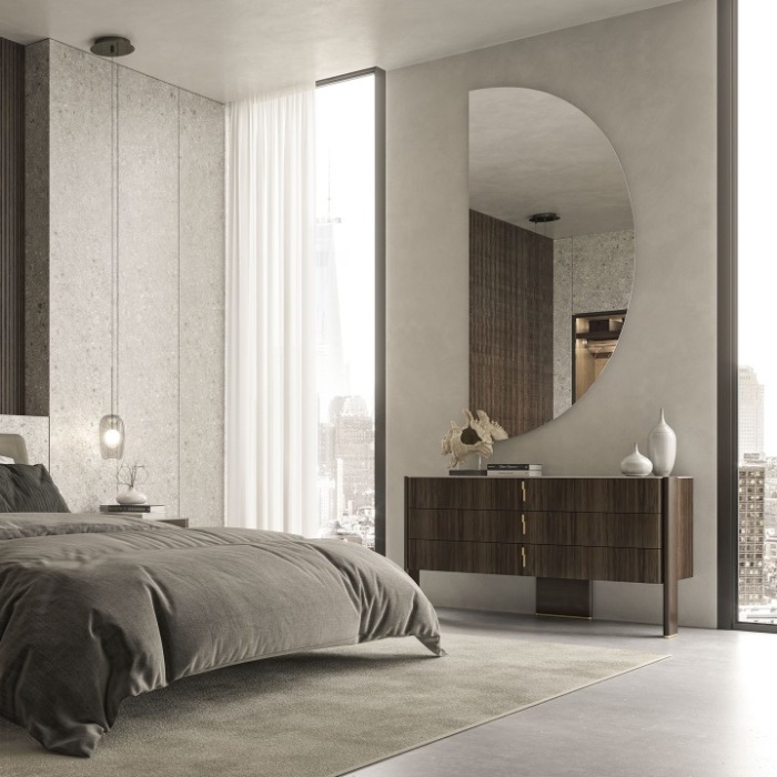 Comò a tre cassetti in noce Canaletto (NC) o rovere bruciato (RB). Struttura in legno verniciato goffrato bronzo (GF18) e particolari in acciaio verniciato ottone. Top in ceramica Marmi nei colori Portoro opaco (KM07), Corcovado (KM14) o in cristallo specchiato bronzo.