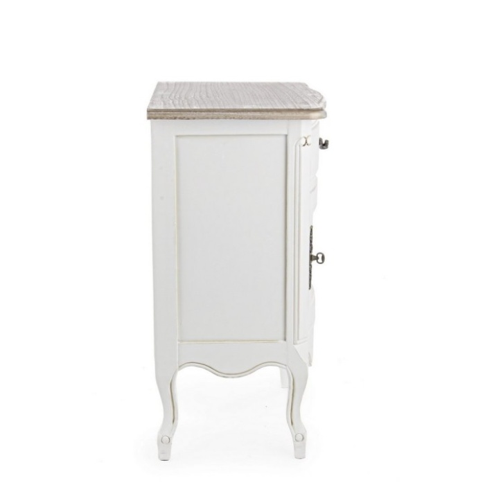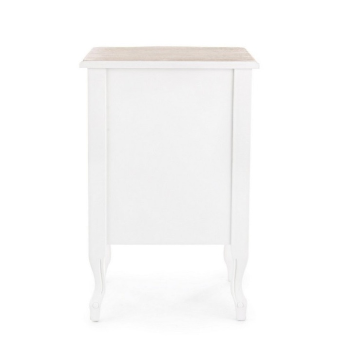 Il piano superiore in legno naturale impiallacciato crea un piacevole contrasto con il resto della struttura, verniciata in bianco con una finitura a base d'acqua, ecologica e sicura per l'ambiente. Questa combinazione di materiali e tonalità dona al comodino un aspetto equilibrato e armonioso, adatto sia ad ambienti tradizionali che moderni che desiderano un tocco di classicità. Il bianco delicato si integra facilmente con diverse palette cromatiche, rendendo il mobile una soluzione flessibile per qualsiasi arredamento.