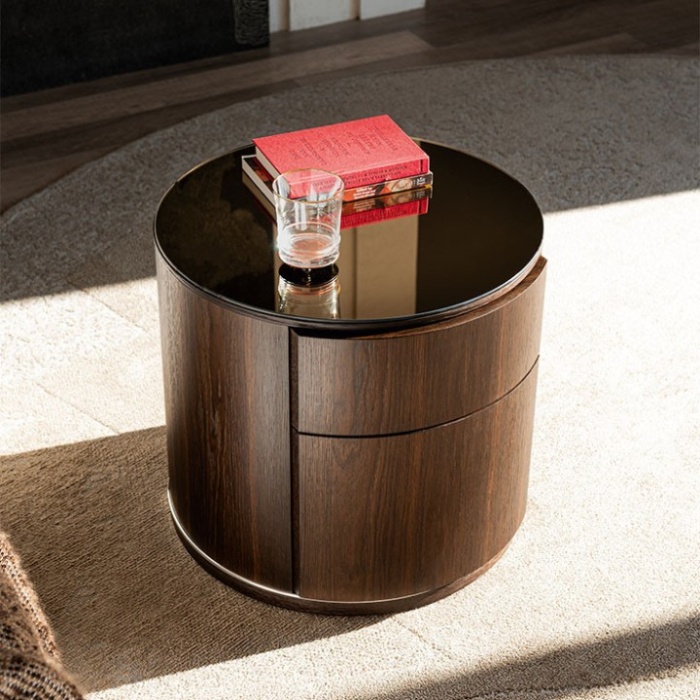 La sua struttura cilindrica, perfettamente liscia e uniforme, racchiude al suo interno due pratici cassetti con apertura push-pull, che garantiscono comodità d’uso mantenendo un’estetica pulita e priva di interruzioni. Il profilo superiore arrotondato, realizzato con una delicata circonferenza in legno, evidenzia la cura artigianale che contraddistingue questo complemento.