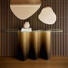 Nettuno risulta quindi snella e imponente allo stesso tempo, soprattutto se si sceglie di arricchire la base con una finitura della linea Brushed: spazzolata a mano libera da abili artigiani. La base in metallo curvato viene realizzata in un pezzo unico, aumentando il pregio di questa consolle in vetro di cui è possibile ammirare la morbida silhouette nella sua interezza.