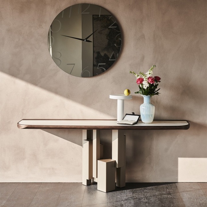 La famiglia Skyline comprende diversi modelli di tavoli di design e affascinanti consolle moderne. Il suo design prende ispirazione dai profili delle metropoli, che decorano l'orizzonte con linee slanciate e volumi tridimensionali. L'acciaio verniciato della base riflette la luce da diverse angolazioni, creando un effetto chiaroscuro che varia a seconda dell'illuminazione dell'ambiente.