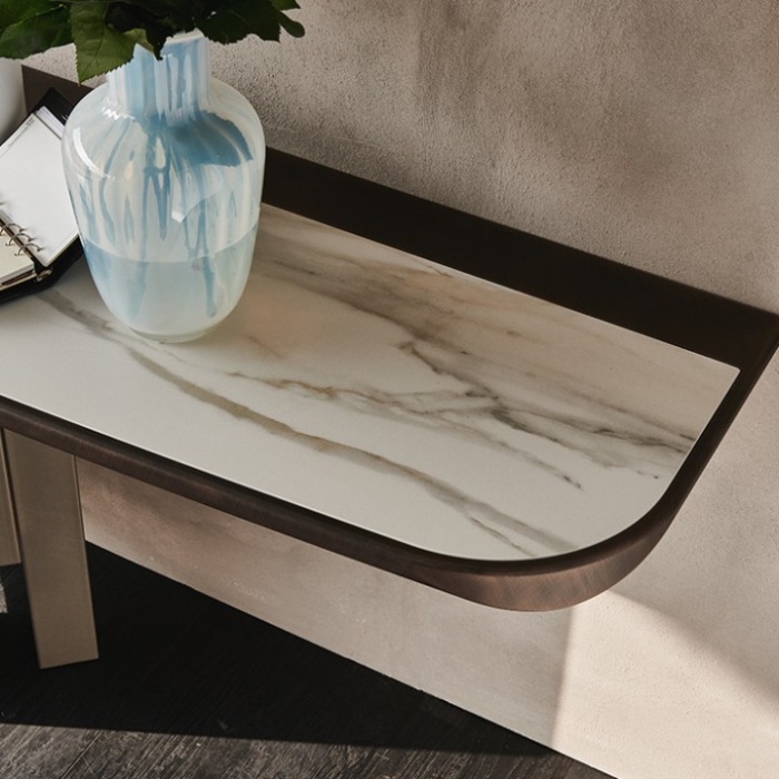 La consolle in legno Skyline ha bordi irregolari in massello. Mentre piano in ceramica e profilo spesso caratterizzano la consolle moderna e raffinata Skyline Keramik Premium.