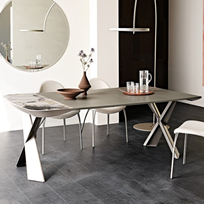 La prima è valorizzata dall’elegante cornice Brushed Bronze o Brushed Grey. Mentre la seconda è un tavolo consolle allungabile che, grazie ad un ingegnoso meccanismo di prolunghe e supporti, raggiunge 2 metri di lunghezza, trasformandosi in un magnifico tavolo pronto ad accogliere gli ospiti.