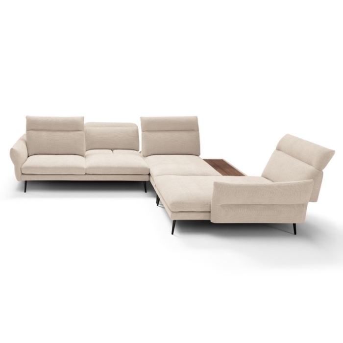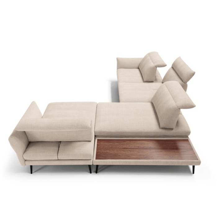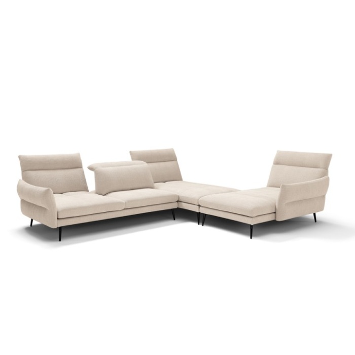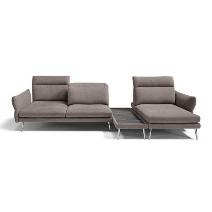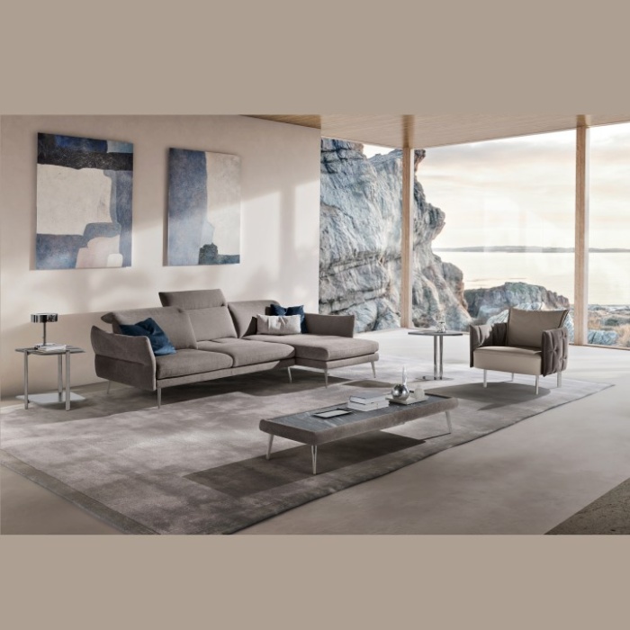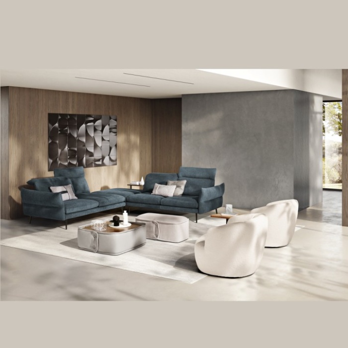 Il design è completato da eleganti piedi in metallo e dalla possibilità di scegliere tra rivestimenti in pelle o tessuto, rendendo il divano altamente personalizzabile.