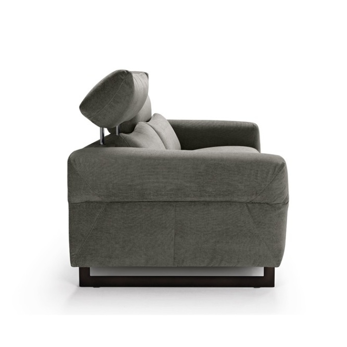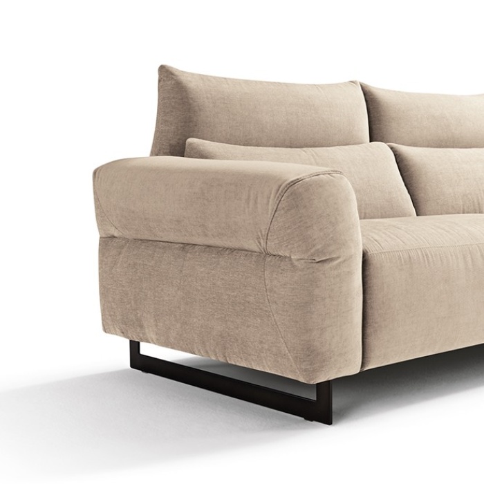 Il design del divano è impreziosito da braccioli dal profilo asimmetrico, un dettaglio stilistico distintivo che lo rende unico nel suo genere.