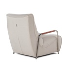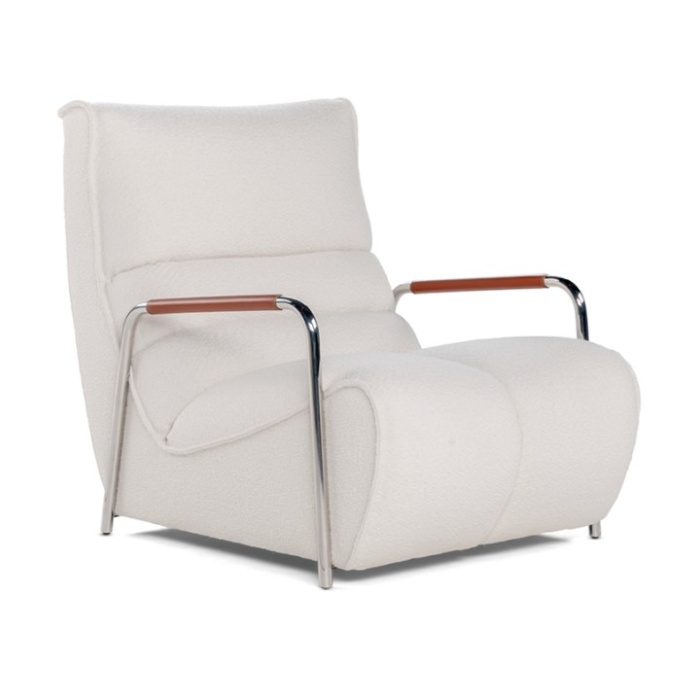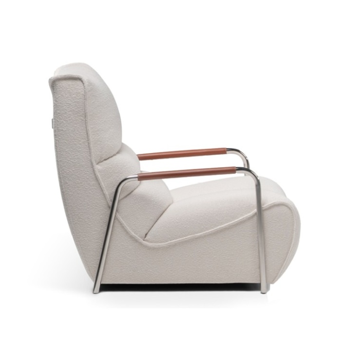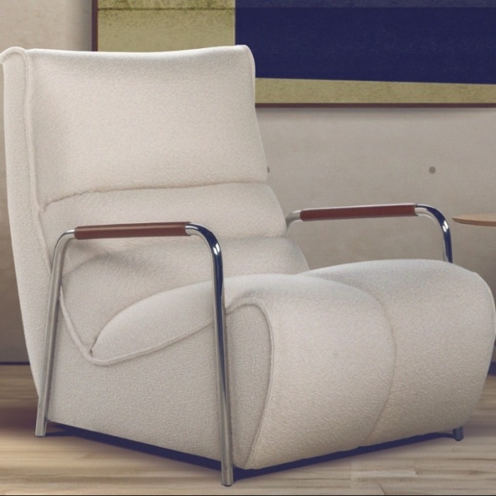 L’appoggio del braccio, nella poltrona, è reso possibile dalla presenza di una struttura tubolare, che funge da bracciolo, protetta nella parte superiore dal cuoietto. La struttura in metallo, la cui forma si ispira agli stilemi del movimento moderno, sorregge la poltrona avendo la doppia funzione decorativa e statica.