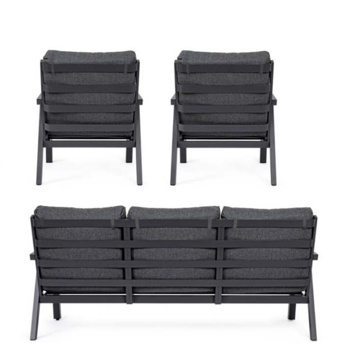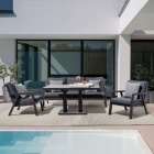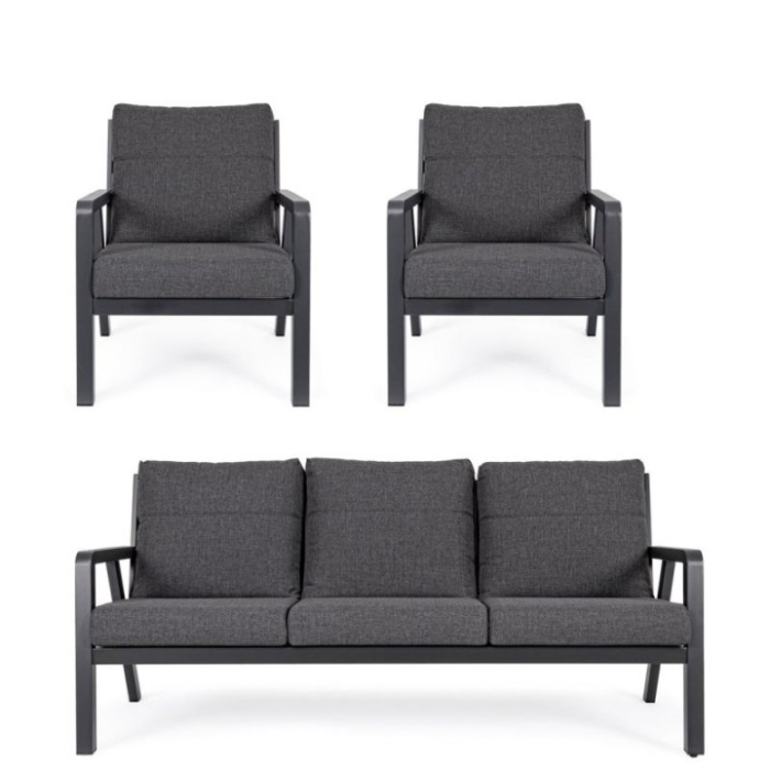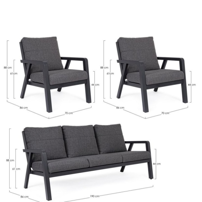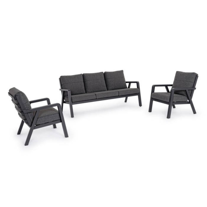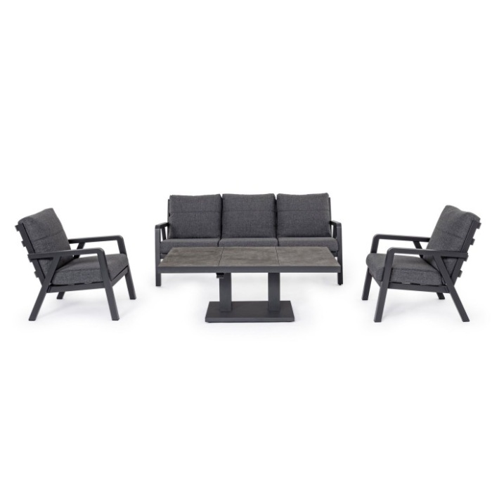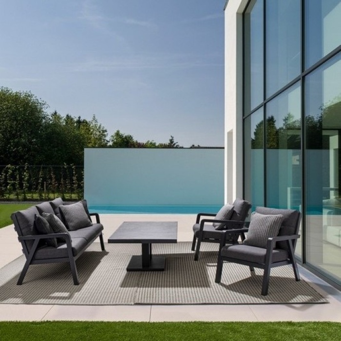 Composto da 1 divano tre posti, 2 poltrone e 1 tavolino, questo set è ideale per arredare terrazze, verande o giardini, offrendo un ambiente accogliente e moderno.