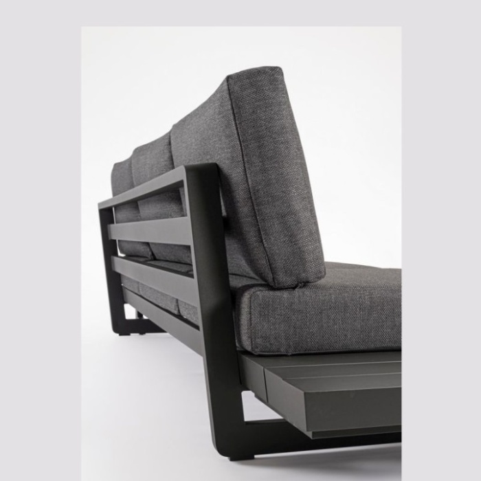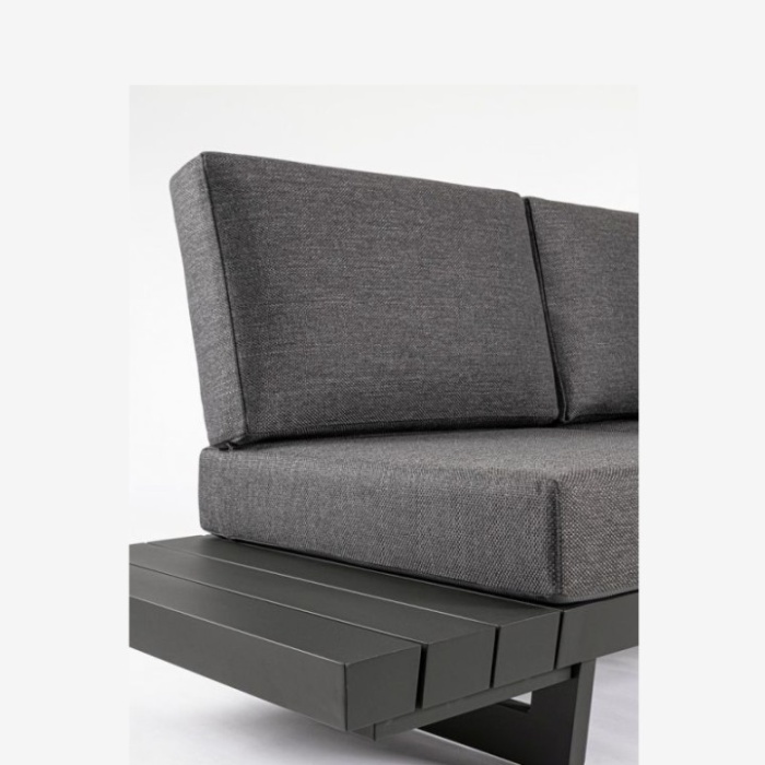 Ogni divano modulare ha una struttura in alluminio verniciato a polvere e cuscini sfoderabili in tessuto idrorepellente Olefin.