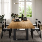 Il piano può essere richiesto con bordo dritto, per un design più squadrato e tecnico, oppure con bordo scortecciato, che mantiene l'andamento irregolare del tronco originale, conferendo al tavolo un carattere unico e irripetibile.