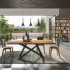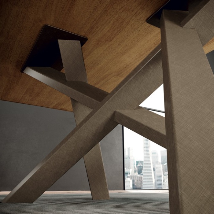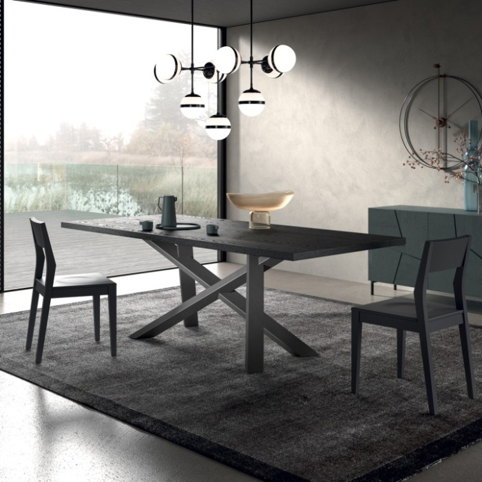 Grazie al suo basamento antracite (personalizzabile su richiesta anche in finiture Bronzo o Carbon), il tavolo Crossing si abbina magnificamente a sedie con dettagli scuri o strutture metalliche. Per un look coordinato, suggeriamo le sedie Ruby o Maya, che riprendono le essenze del legno FGF, creando un ambiente dining armonioso e di forte impatto visivo.
