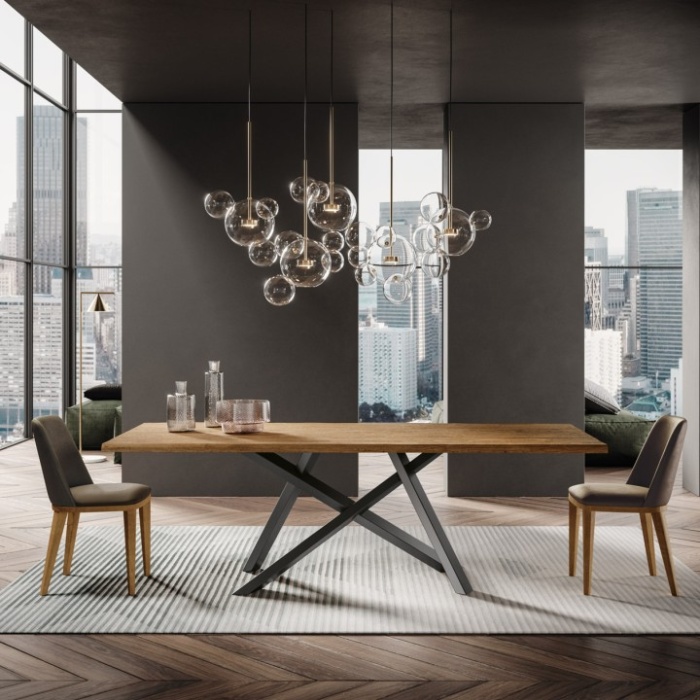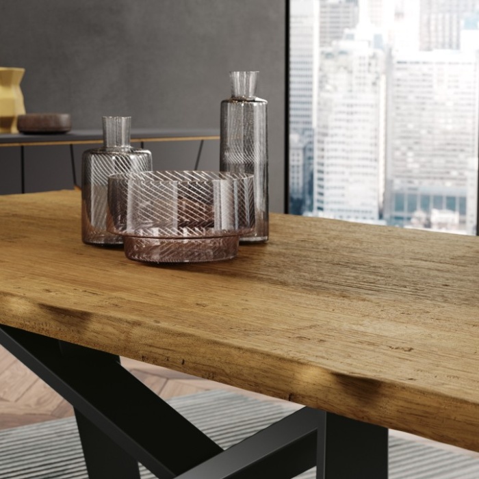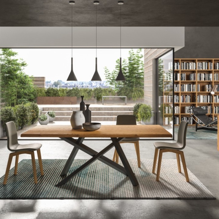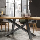 Il tavolo Crossing rappresenta una delle creazioni più amate della collezione FGF Mobili, progettato per chi desidera un arredamento che comunichi solidità e modernità. Il fulcro del design risiede nel suo basamento: una struttura in metallo con sezione 100x50 mm che si incrocia geometricamente, creando un gioco di volumi che sostiene con leggerezza visiva l'imponente piano in vero legno. È un tavolo pensato per durare nel tempo, capace di resistere alle mode e all'usura quotidiana grazie alla qualità dei materiali selezionati.