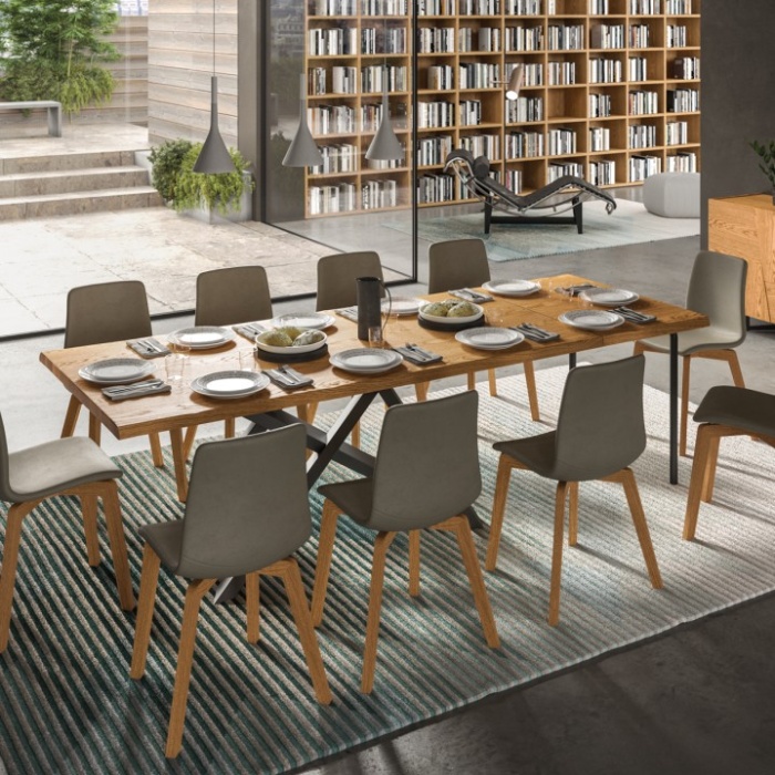 Il Crossing non è solo un pezzo da esposizione, ma un elemento funzionale studiato per le esigenze dell'abitare contemporaneo. Oltre alla versione rettangolare standard, il basamento Crossing può sostenere anche piani a Botte o Tondi, offrendo soluzioni d'arredo per ogni configurazione di spazio. Per chi necessita di maggiore flessibilità, la versione estensibile permette di aggiungere spazio extra per gli ospiti con un sistema di allunghe fluido e stabile, mantenendo inalterata l'estetica industriale del basamento.