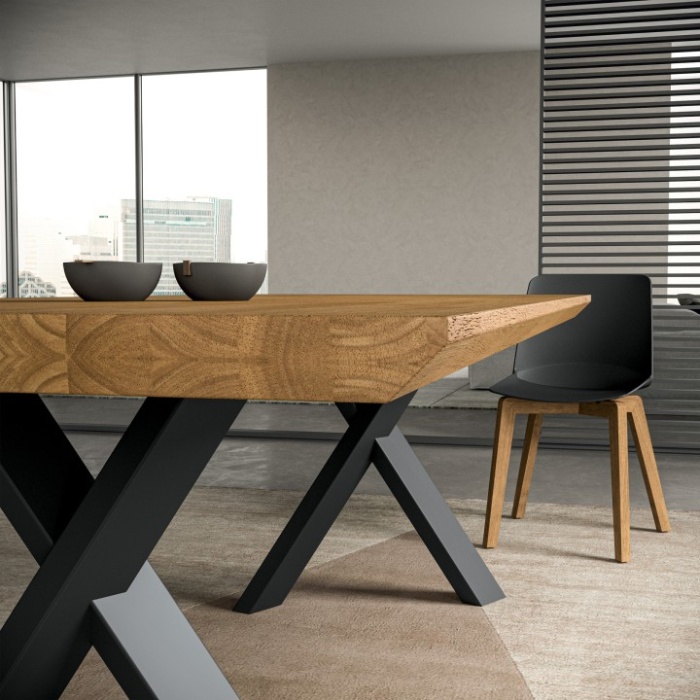 Il nome "Walking" evoca il dinamismo grafico del suo basamento. Le gambe, realizzate in metallo con finitura di serie Antracite (personalizzabile su richiesta in finiture Carbon, Bronzo spazzolato o colori RAL), hanno una sezione di 100x50 mm. Questa struttura garantisce una stabilità impeccabile anche nelle versioni di grandi dimensioni, creando un contrasto materico affascinante con il piano in legno.
