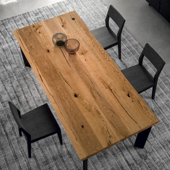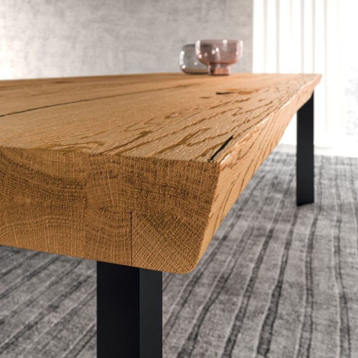 Lo spessore del piano può essere di 40 mm per un look più moderno e snello, o di 60 mm per un impatto estetico imponente e rustico. I bordi possono essere richiesti dritti, per un minimalismo rigoroso, o scortecciati, per mantenere l'andamento naturale della corteccia originaria.