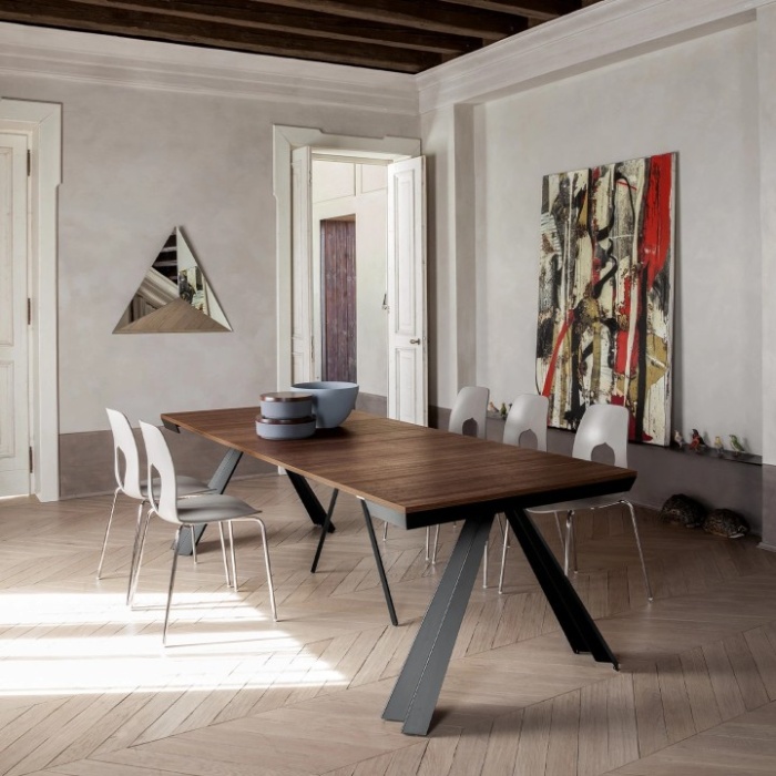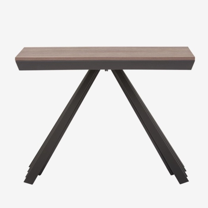 La consolle Ventaglio è un capolavoro di versatilità e design, capace di trasformarsi con facilità da elegante complemento d’arredo a tavolo ampio e funzionale, ideale per ospitare numerosi commensali. La sua base in metallo sagomato laccato, dal carattere moderno e scultoreo, garantisce stabilità e un impatto visivo distintivo. Le finiture disponibili – bianco opaco, nero opaco o bronzo pietra – si abbinano con armonia ai piani in effetto legno, offrendo combinazioni raffinate come noce Canaletto, rovere scuro con effetto a rilievo e bianco opaco. Il meccanismo di allungamento, pratico e intuitivo, rende Ventaglio una soluzione ideale per chi cerca funzionalità senza rinunciare all’eleganza.