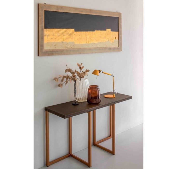 Meccanismo a ribalta e materiali di pregio La magia di Flap risiede nel suo piano superiore. Con un semplice movimento a "flap" (ribalta), la consolle raddoppia la sua profondità arrivando a 30 cm, offrendo una superficie solida e spaziosa per ospitare lampade, vasi o libri. La struttura in metallo garantisce una stabilità impeccabile ed è personalizzabile in numerose finiture goffrate (come il Bronzo, il Grafite o il Bianco), permettendo di giocare con i contrasti o di mimetizzare il mobile con il colore della parete. Il piano è disponibile in nobilitato di alta qualità, con texture materiche che spaziano dall'effetto legno termocotto al moderno effetto cemento o pietra.