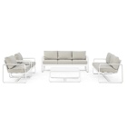 I cuscini della seduta e dello schienale, completamente sfoderabili, sono rivestiti in tessuto idrorepellente Olefin (100% polipropilene), un materiale resistente a schizzi e umidità, che garantisce al tempo stesso praticità e comfort.