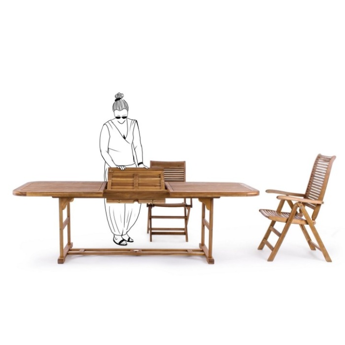 La struttura è interamente realizzata in legno di acacia, una scelta estetica e resistente che dona calore e solidità all’ambiente.