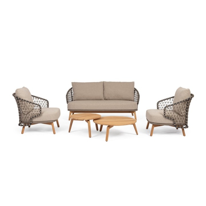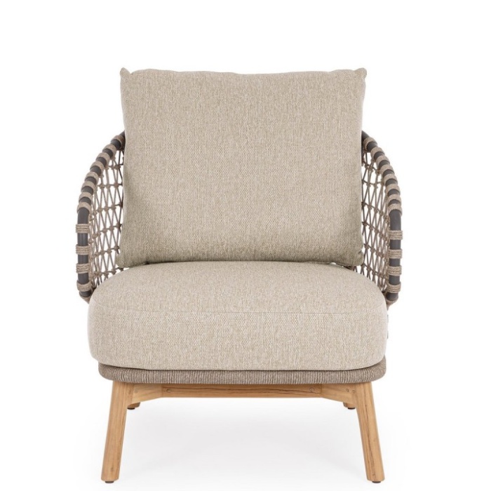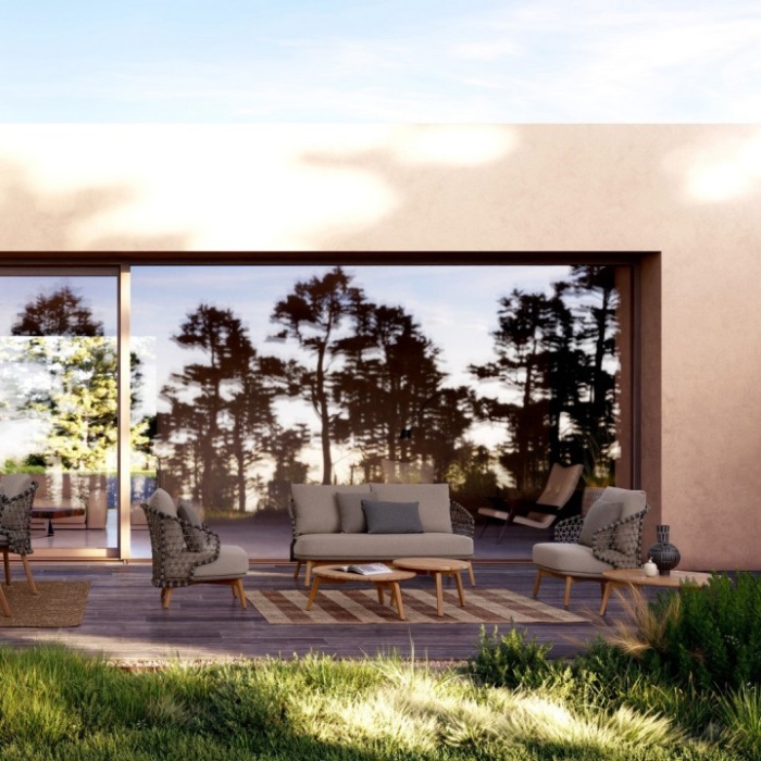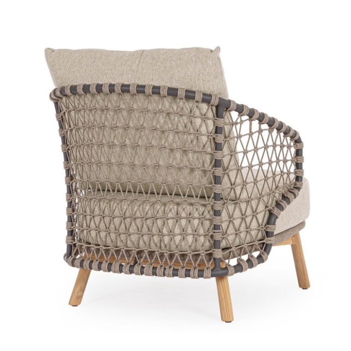 L’intreccio in corda di polipropilene per esterno garantisce un effetto visivo di grande pregio e assicura comfort e resistenza agli agenti atmosferici.
