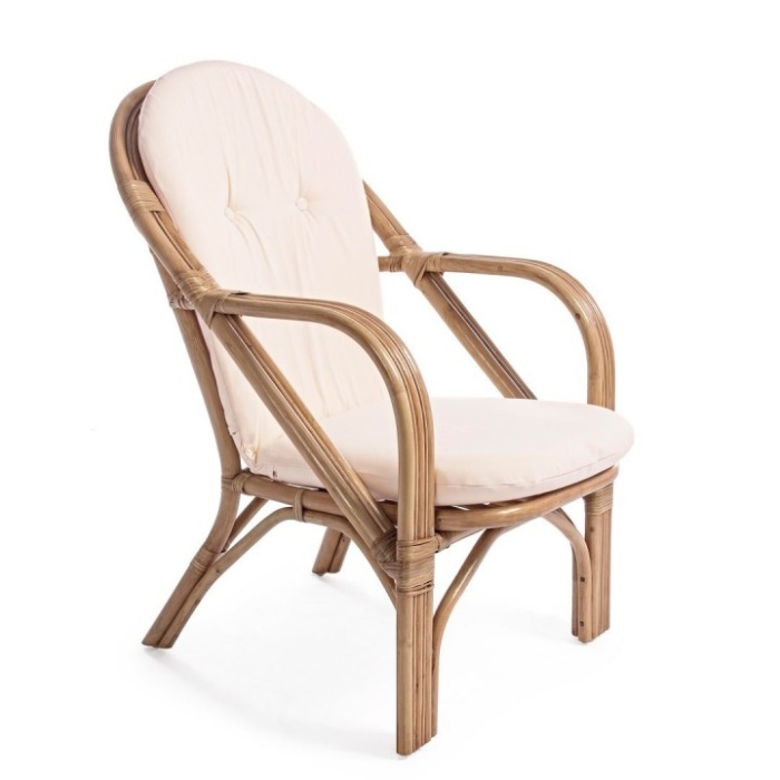 Realizzata in rattan con finitura in vernice melaminica, è dotata di un cuscino seduta sfoderabile e uno schienale fisso in poliestere.