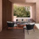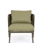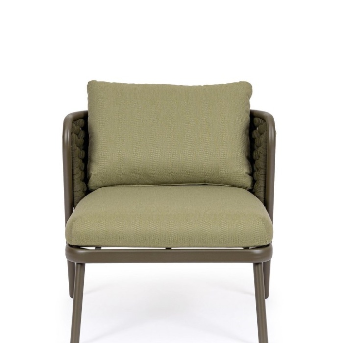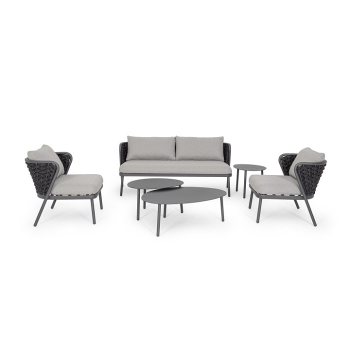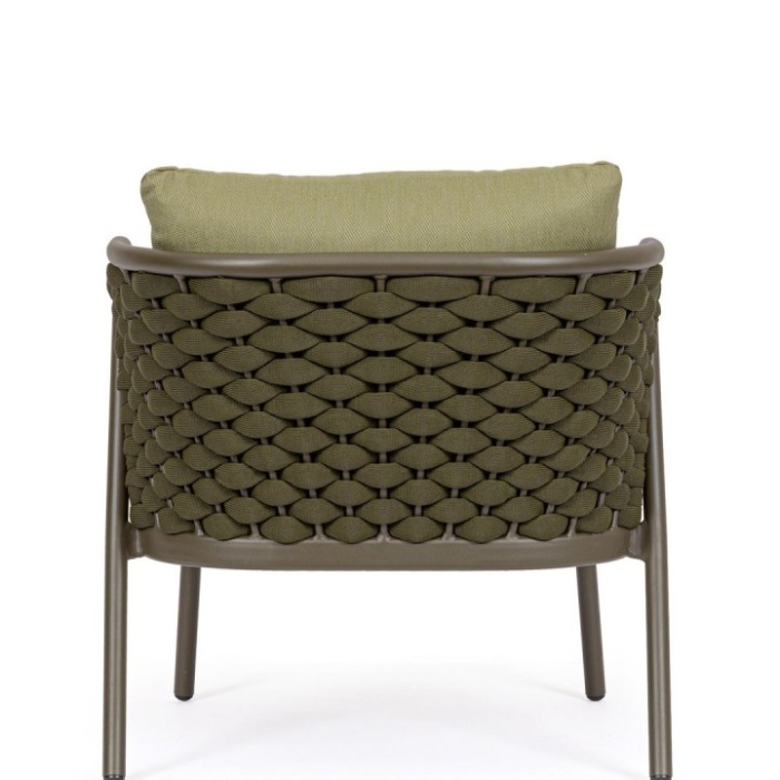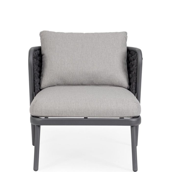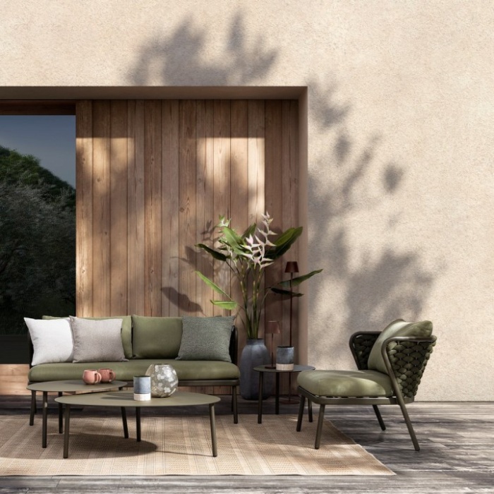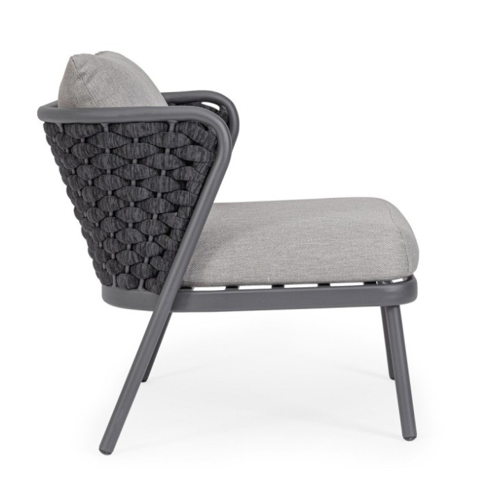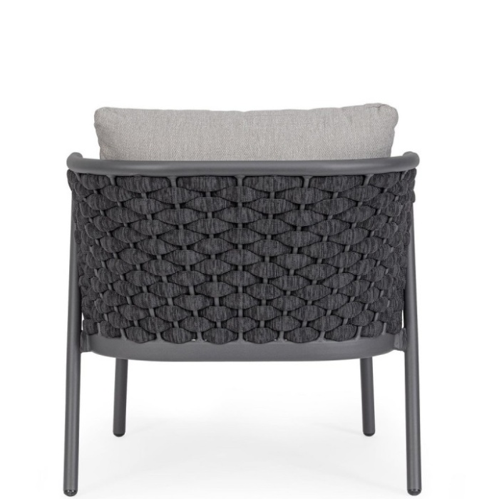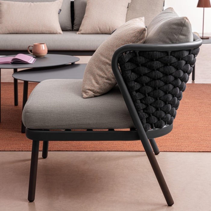 Un elemento distintivo è l’intreccio in corda di textilene, materiale altamente resistente ai raggi UV e all’umidità, con imbottitura in gomma nitrilica che garantisce una seduta confortevole e durevole nel tempo.